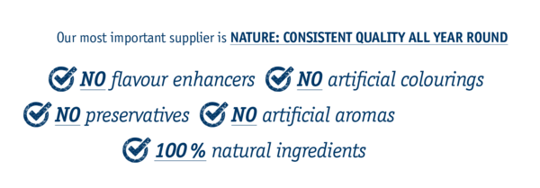 • The use of 100% natural ingredients with no added aromas, colourings and flavour enhancers